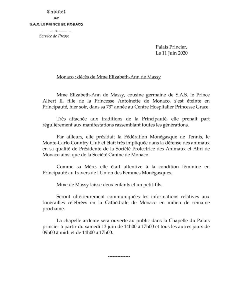 Mme Elizabeth-Ann de Massy, cousine germaine du Prince Albert II, est décédé au Centre Hospitalier Princesse Grace le 10 juin. Elle était âgée de 72 ans.