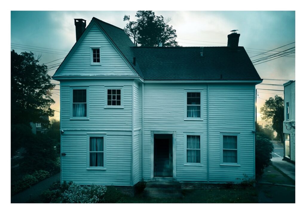 Le célèbre peintre Edward Hopper, que l’on ne présente plus, a beaucoup inspiré Annie Leibovitz dans son esthétique photographique. En 2023, elle ressuscite la complicité amoureuse et artistique du peintre avec sa femme Joséphine en réalisant une série de photos mettant en scène deux modèles qui incarnent le couple. Prise dans le cadre de cette série, cette photographie montre la maison d’enfance du célèbre peintre, dans un contraste de lumière et de vie qui rappelle les oeuvres célèbres et mélancoliques de Hopper. Une aquarelle du peintre réalisée en 1946 montre d’ailleurs sa femme Jo à l’avant d’une voiture dans le Wyoming en train de peindre une toile… un écho troublant avec le cliché de David Hockney !