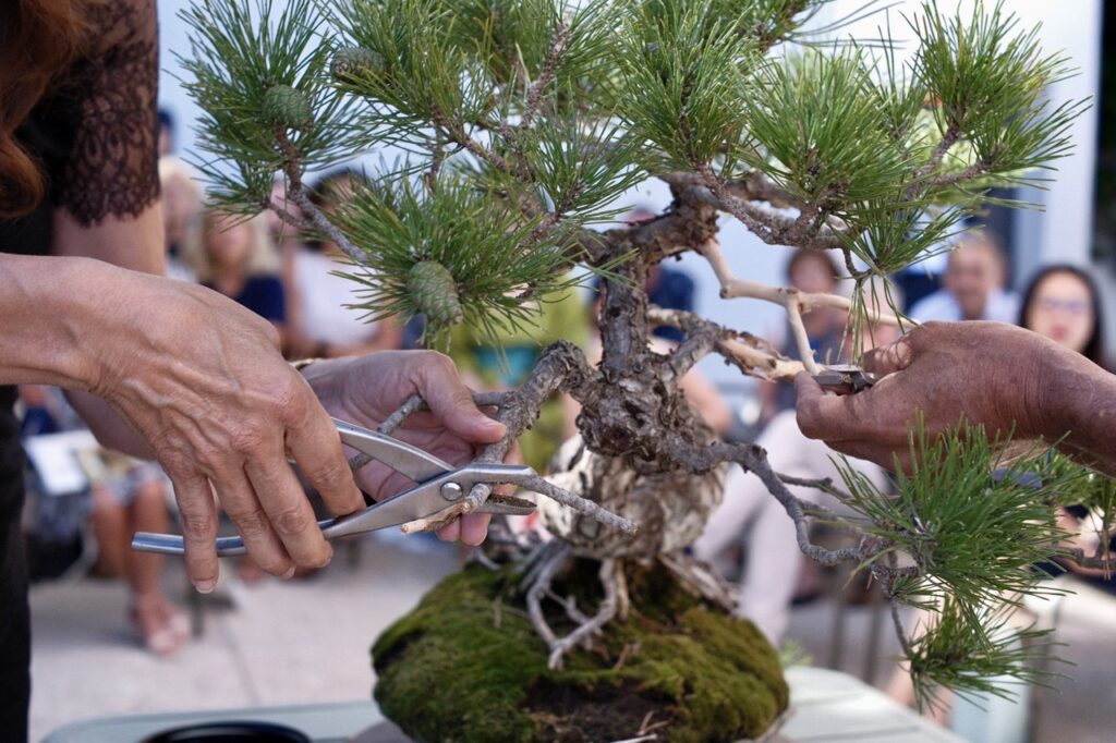 Protégés du soleil par deux grands parasols blancs, deux bonsaï trônent sur une table de fortune installée sur la terrasse de la Villa Paloma. Mis à disposition par Jonathan Pons, de Bonsaï Center, l’un des deux pins noirs touffus s’apprête à recevoir une taille méticuleuse réalisée par Koji Hiramatsu, maître bonsaïka.