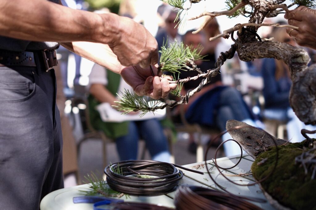 La démonstration se déploie alors selon un protocole immuable : désépaississement des pousses superflues, création des Jin – ces branches mises à nu de leur écorce qui confèrent à l’arbre son caractère vénérable –, puis ligature au fil métallique. « Ligaturer deux branches permet d’imposer une direction, de contraindre l’arbre en lui donnant une nouvelle forme », détaille le maître, sollicitant l’aide d’un membre de l’assistance pour la création des Jin.