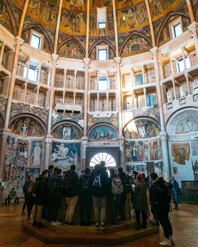 Parme est l’une des rares villes d’Italie à offrir une telle concentration de trésors artistiques dans un périmètre entièrement accessible à pied. Le cœur historique se découvre comme un musée à ciel ouvert avec la majestueuse Cathédrale, chef-d’œuvre en marbre rose de Vérone, à quelques pas du Baptistère décoré de peintures à la tempéra de la seconde moitié du XIIIe siècle. En poursuivant la visite, la Chambre de Saint-Paul, véritable manifeste de la Renaissance italienne, révèle les fresques du Corrège au plafond.
