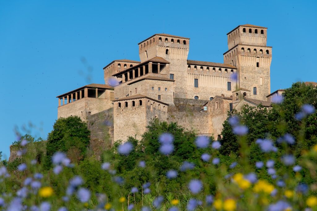 Non loin de la production du jambon de Parme s’élève le château de Torrechiara, véritable joyau médiéval offrant l’une des vues les plus impressionnantes de la région : un panorama infini sur les vignobles, les champs dorés et les premiers reliefs des Apennins. On s’y arrête volontiers pour flâner le long de ses remparts en pierres, se laisser porter par le silence vibrant de la nature et ressentir cette atmosphère hors du temps.
