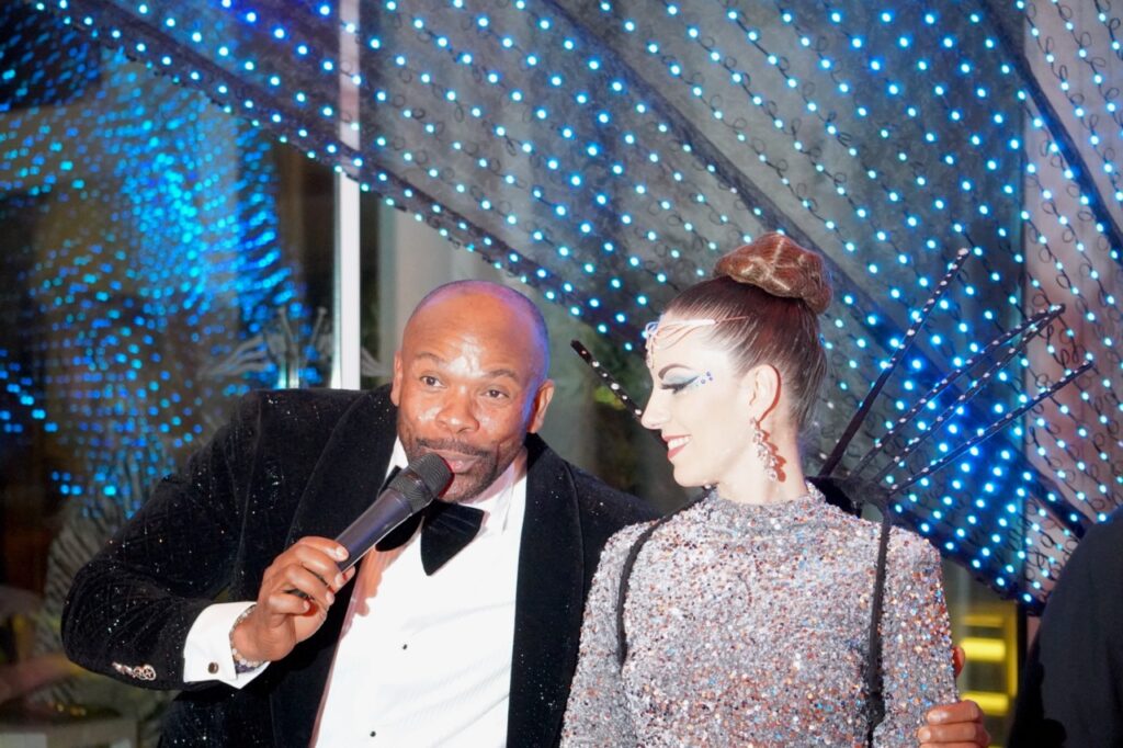 Il fallait, pour accéder à la Ballroom du Yacht Club de Monaco jeudi soir, passer entre des sirènes juchées sur de grandes échasses et sillonner les allées avec de jeunes hommes costumés de LED bleues évoquant la forme d’un coquillage. Un seuil symbolique vers un monde où l’océan était roi. Rorqual, cachalot, dauphin de Risso… Dans cette salle où les tables portaient les noms de cétacés, l’association The Animal Fund (TAF) célébrait ses dix années d’existence lors d’un gala qui tenait autant de la fête que du manifeste. Pour rappeler leur engagement, quelques invitées avaient même opté pour des robes aux motifs inspirés des coraux.