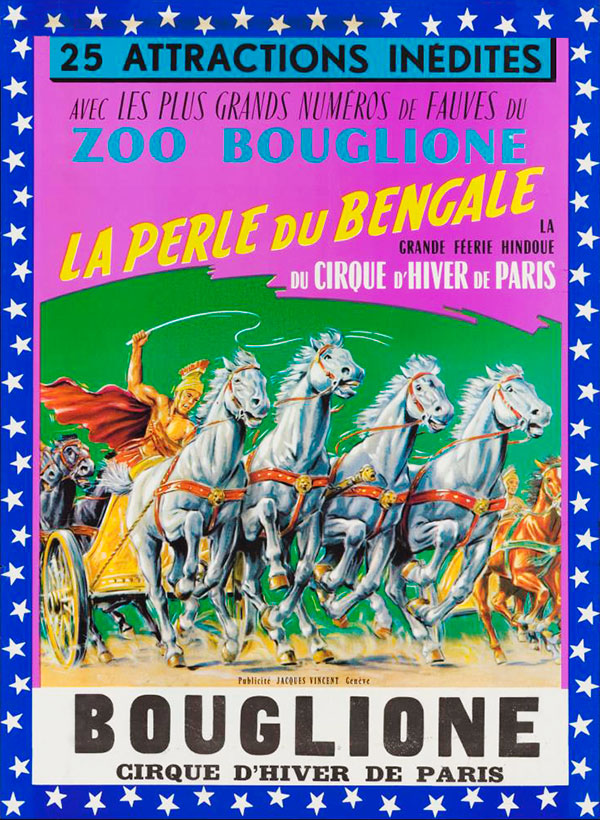 Puis les grandes maisons d’imprimerie s’en emparent, comme Friedlander à Hambourg, et produisent des centaines d’affiches aux codes précis : éléphants, fauves, clowns, acrobates, déclinés à l’infini. L’influence de la publicité à l’américaine a bouleversé ces conventions avec des affiches pouvant comporter jusqu’à cent panneaux différents, formant des fresques monumentales. De nombreux exemples sont aujourd’hui encore visibles dans la collection du musée du Cirque d’Alain Frère.
