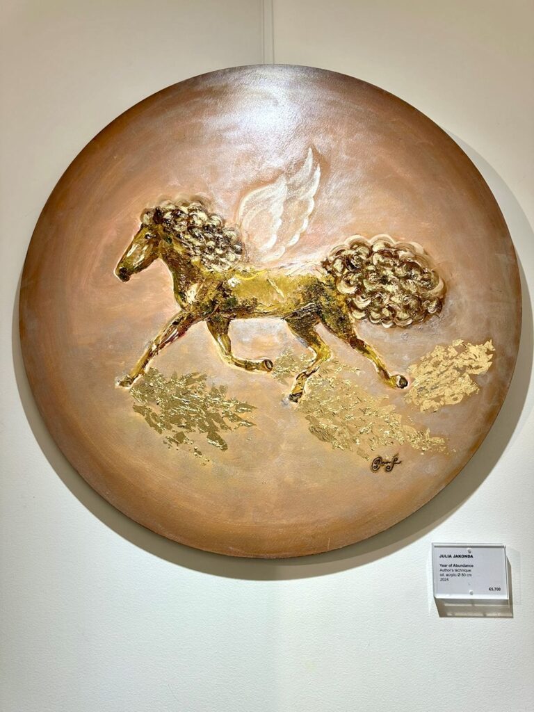 Parmi ses créations récentes, Years of Abondance (2025), toile circulaire de 80 centimètres, met en scène la figure du cheval — symbole de mouvement, de résilience et de progression déterminée, reflet d’une transformation assumée dans la vie comme dans les affaires.