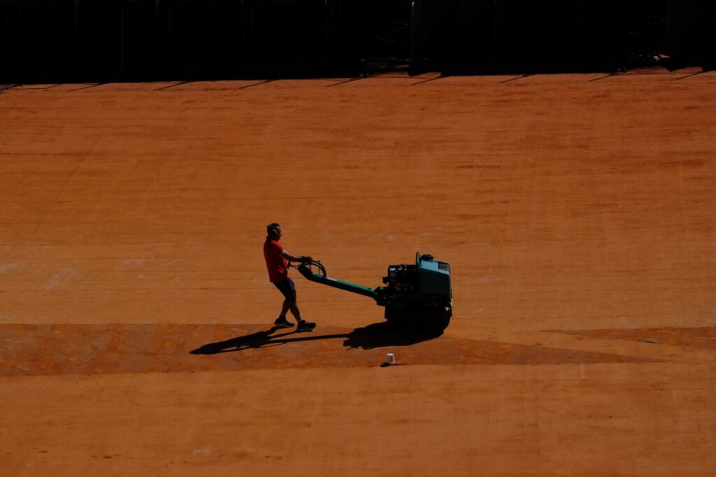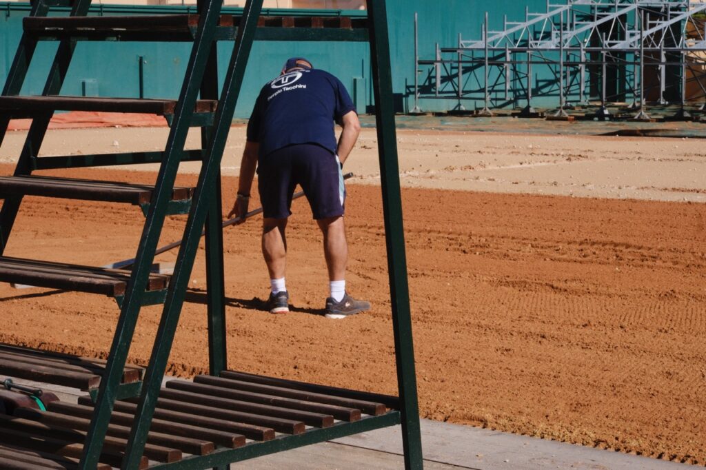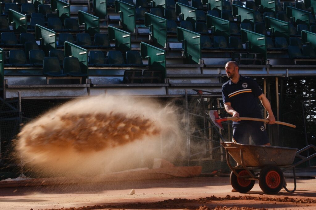 Car la terre battue est une surface fragile, presque organique, en perpétuelle interaction avec les éléments. « Par temps chaud, du calcium en granulés est épandu pour conserver l’humidité », explique l’expert. La pluie impose de repousser certaines interventions, « le gel peut causer des dégâts considérables », se souvient-il à propos de conditions particulièrement difficiles en 2012. Mais l’ennemi le plus redouté reste invisible : « Le pire, c’est le vent, car il retire de la matière. » Chaque jour, la surface se transforme, et chaque matin de tournoi, l’équipe remet de la terre, ajuste, corrige. Un court en terre battue ne se construit pas une fois pour toutes : il se maintient, il se soigne.