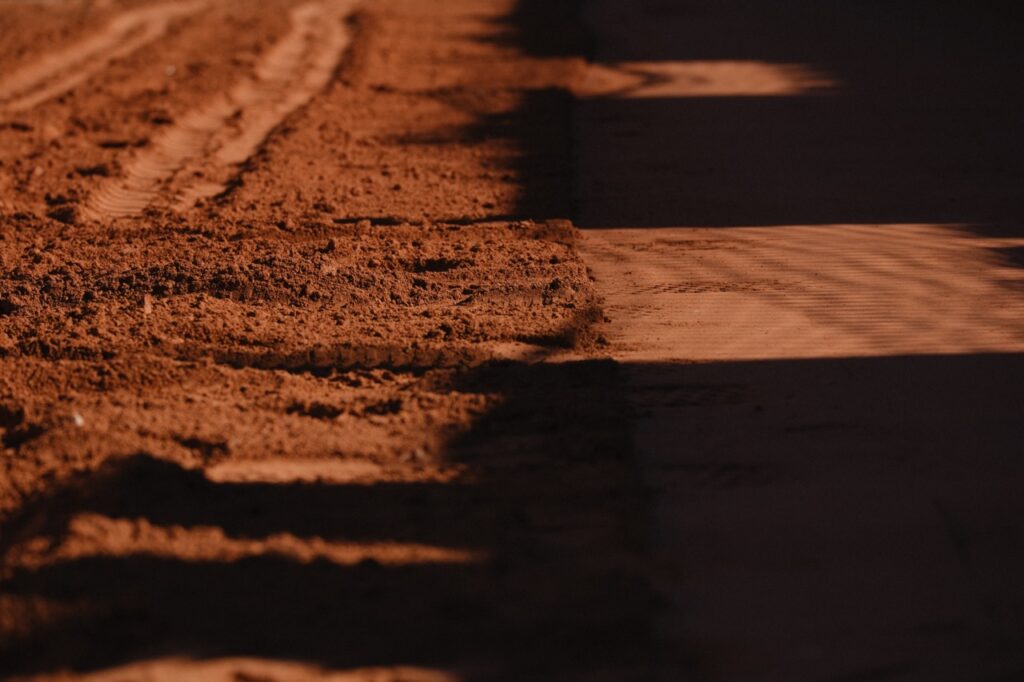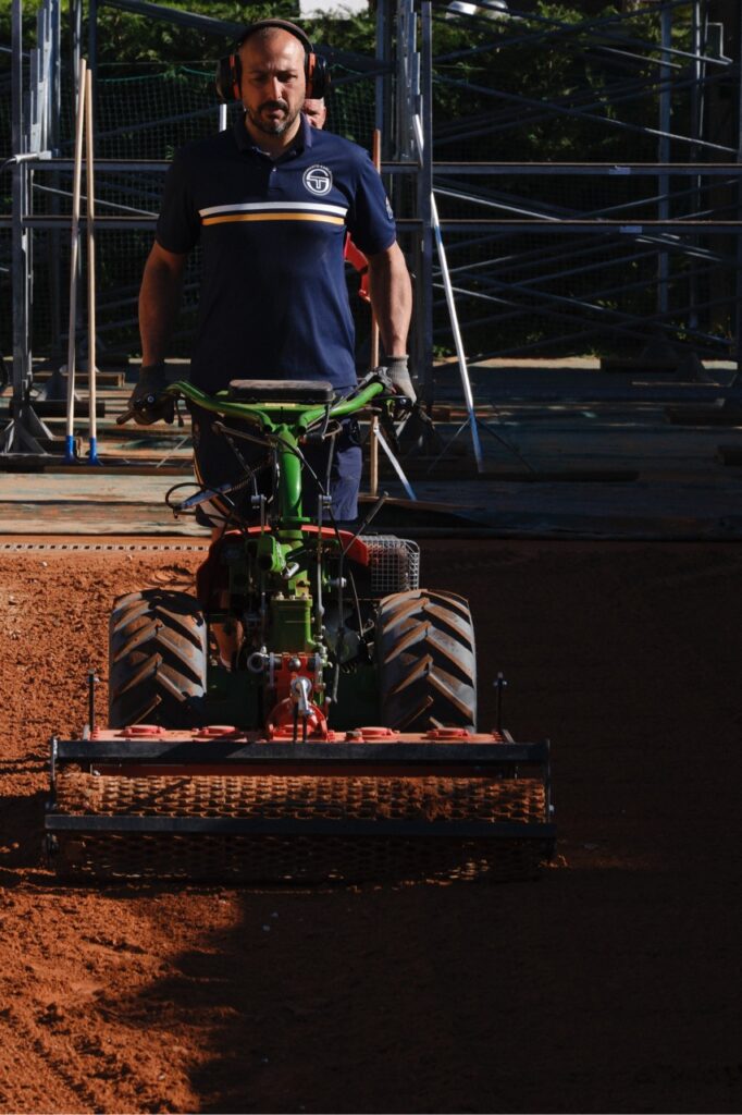 Une fois les lignes retirées, le court doit être abaissé de sept centimètres, puis labouré pour refaire les pentes. C’est à ce stade que de la terre battue est rajoutée pour combler les trous et les irrégularités que Michel a repérés. Car la terre battue, contrairement à une idée reçue tenace, n’est pas rouge. « La terre battue est blanche. La teinte ocre provient des tuiles concassées qu’on étale dessus, par souci esthétique autant que pratique. On distinguerait difficilement la balle jaune sur fond blanc », corrige-t-il. Cette terre blanche constitue le véritable socle du court, acheminée depuis la région parisienne. C’est donc la disposition à la pelle de la couche rouge, un broyat de tuiles importé d’Italie, qui donne aux courts leur couleur iconique et assure la glisse des joueurs. « Un court neuf peut nécessiter une tonne de rouge et un entretien régulier ensuite », indique Michel.