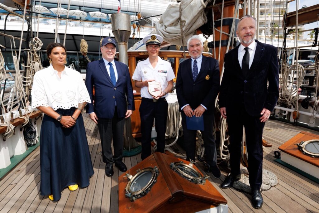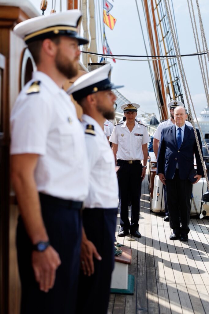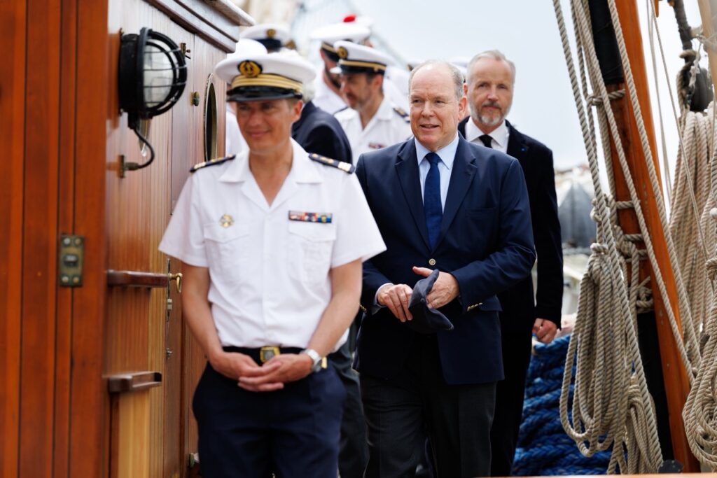 Le Prince Albert II est monté à bord de la goélette L’Étoile, accueilli par le lieutenant de vaisseau Victor Kaars Sijpesteijn, commandant du bâtiment, en présence de l’Ambassadeur de France à Monaco, Jean d’Haussonville.