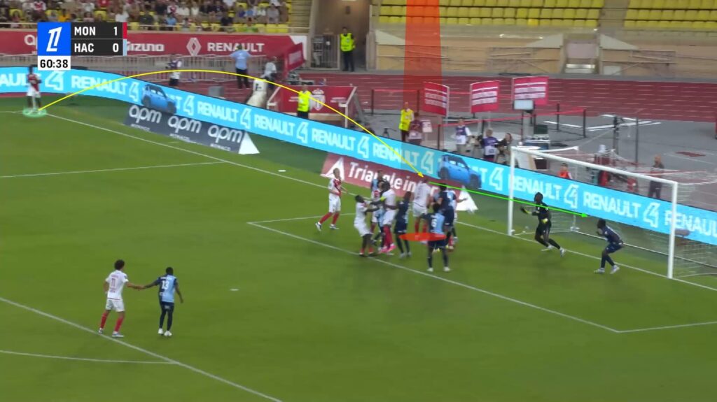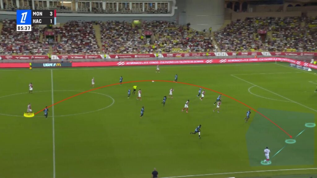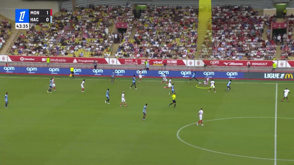 The 31-year-old’s impact extended to how he helped stretch the first line of Le Havre’s press by generating advantageous 3v2s in build-up with his intelligent positioning. As a result, this regularly granted him space to dribble into as he subsequently drew out opponents to then release passes into ASM’s most dangerous attacking players.