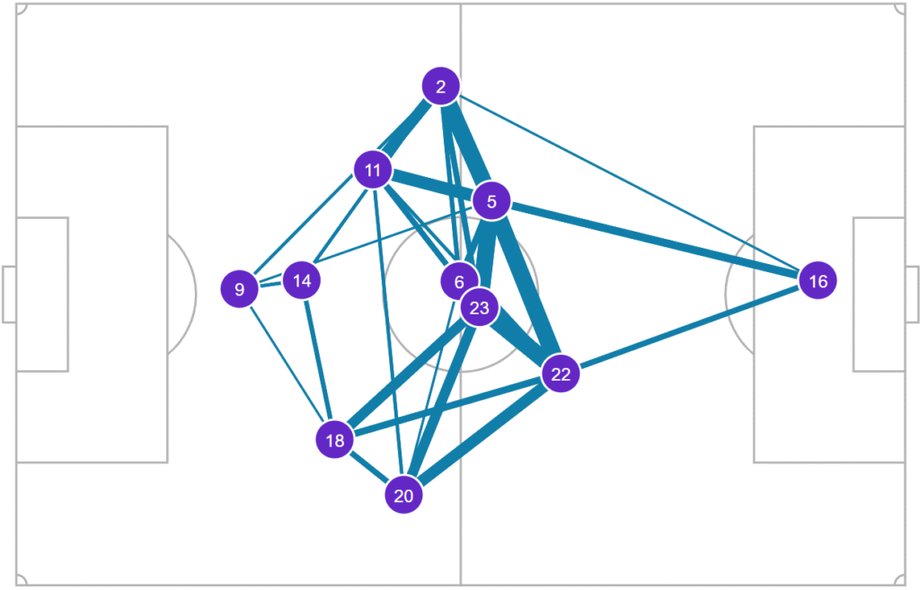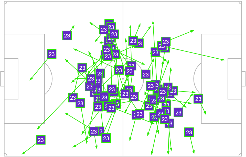 Also thriving at finding pockets of space to support the attack either side of the AJA midfield, creating overloads all over and offering himself as a progressive passing option, these were extra upsides associated with his off-ball prowess. Moreover, much positivity could also be seen in his dovetailing with Zakaria, where he’d sharply recognise when to alternate with the Swiss star.
