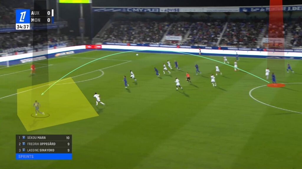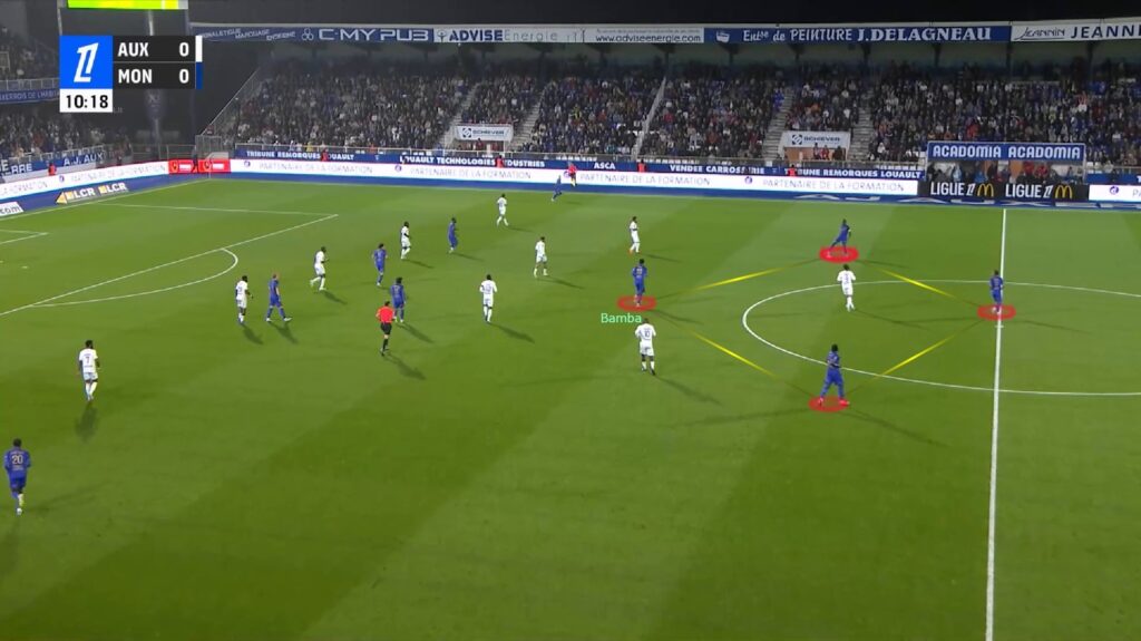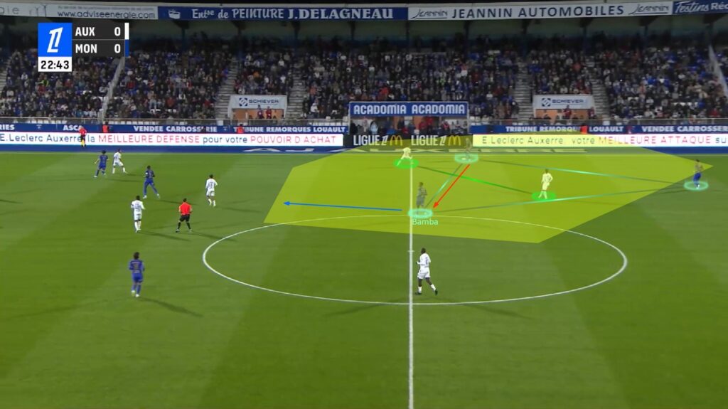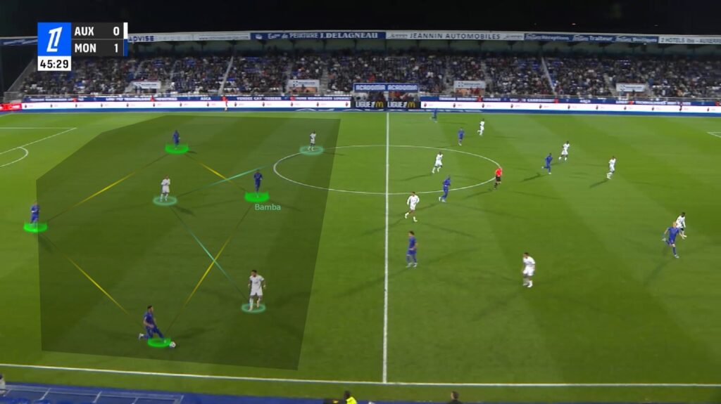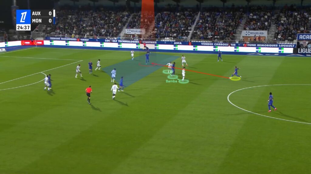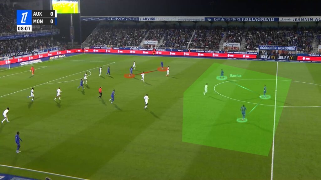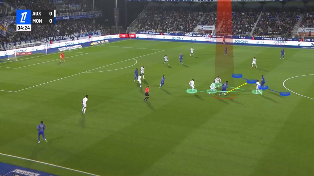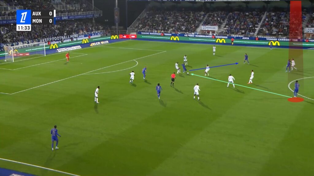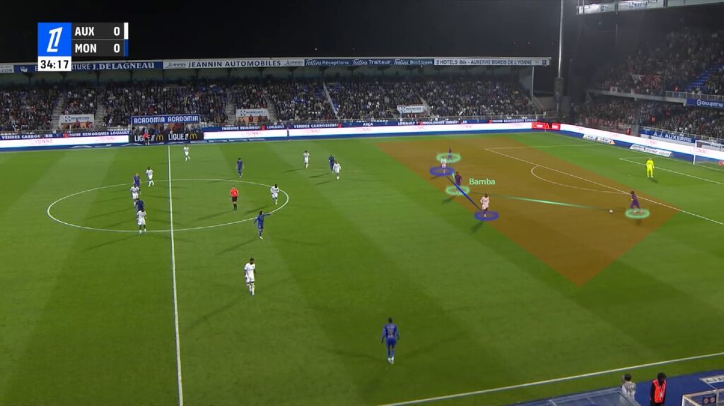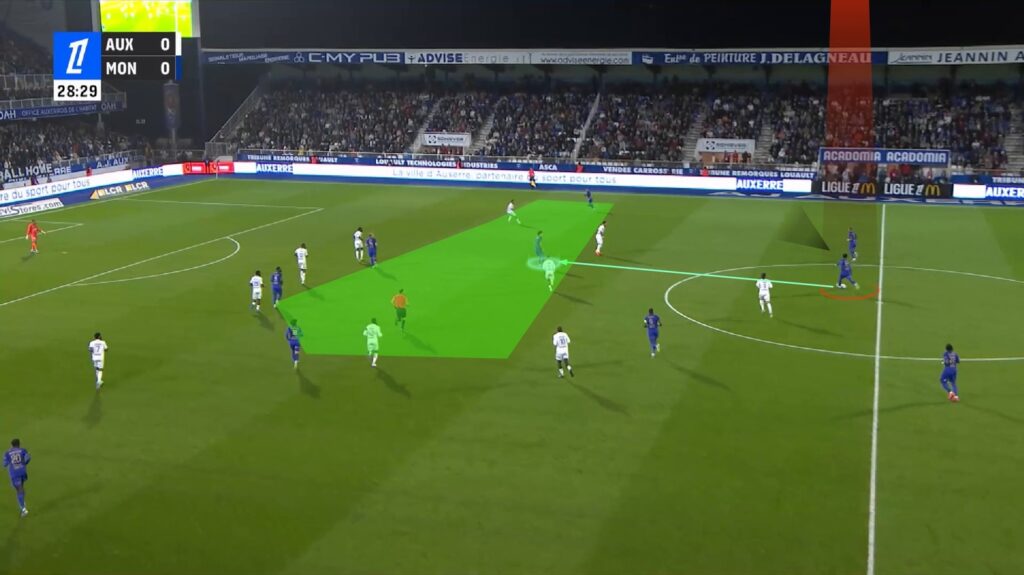 So astute with his movement and positional sense, these were extremely influential aspects towards him assisting his team to get up the pitch. To start with, how he frequently dropped into deep zones on the right to essentially form a situational back three allowed right-back Vanderson to push higher and Maghnes Akliouche to operate more dangerously between the lines. This withdrawn and wide positioning also provided crucial structural stability in case of turnovers and meant ASM could outnumber and smoothly bypass Auxerre’s first line of pressure.