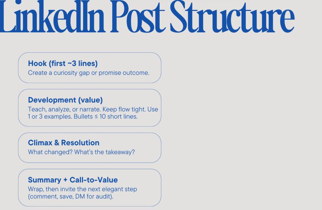 The body of the post delivers the value: an insight, a story, or a framework. The resolution makes the takeaway clear. And the call-to-value invites the reader to reflect, engage, or act.