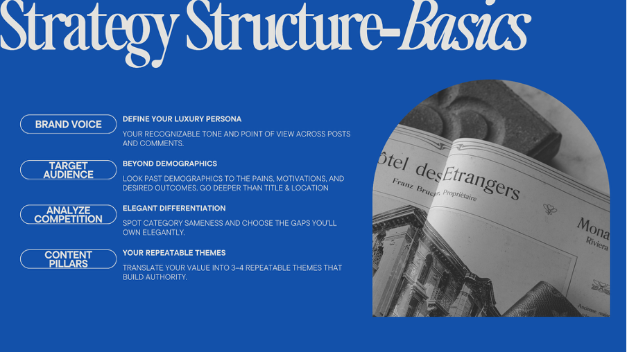 Content pillars are the themes that define your expertise. They ensure your posts feel organised, valuable, and aligned with your positioning.