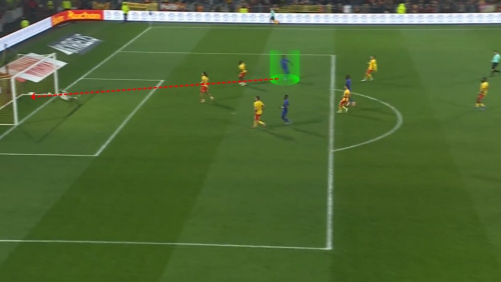 How he pinned and occupied markers to manufacture room for colleagues was important as well, for he did so brilliantly to manipulate and disrupt Lens’ structure to allow runners to exploit gaps both in behind and in front of their backline.
