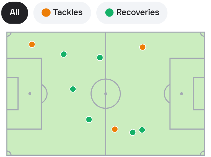 Meanwhile, on the defensive end, his impact was felt through his clever and determined harrying, as he got tight to adversaries to force rushed decisions and limit their time on the ball and waited for the ideal moment to jump.