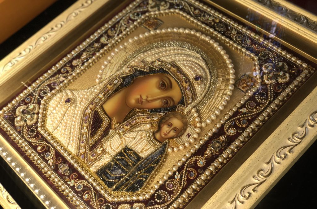 На других выставленных иконах вышиты либо одежды святых, либо фон. В вышивке используются драгоценные и полудрагоценные камни: сапфир, аметист, топаз, танзанит, жемчуг, хризолит и другие.