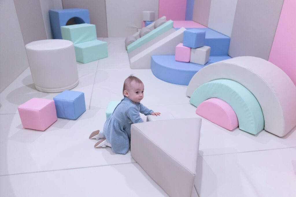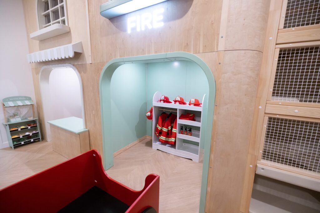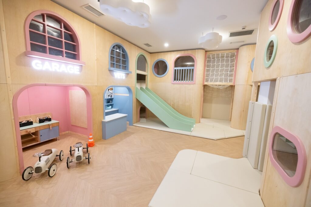 Пространство, разработанное в партнерстве с британской компанией Tiger Play, специализирующейся на изготовлении конструкций на заказ, состоит из нескольких зон. Для детей от 0 до 18 месяцев предусмотрена безопасная зона для развития моторики с мягким покрытием. Дети до 7 лет могут исследовать многоуровневую конструкцию с горками, подвесными мостиками, скалодромами и спусками. Уголок для чтения, зона для строительства и семейное кафе дополняют предложение.